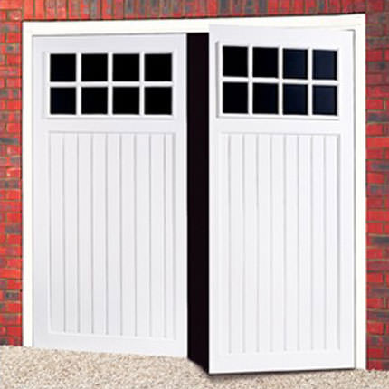 Cardale Bedford ABS plastic side hinged garage door. ABS doors have an impact resistant white low gloss finish which closely matches to white PVCu doors and windows. The door is complete with a maintenance free steel frame with an optional upgrade to high security locking