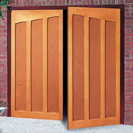 Cardale Shakespeare timber side hinged garage door base coated as standard for on-site finishing with the option of factory pre-staining in Light Oak, Mahogany, Walnut or Burnt Oak. The door is complete with a maintenance free steel frame with an optional upgrade to high security locking