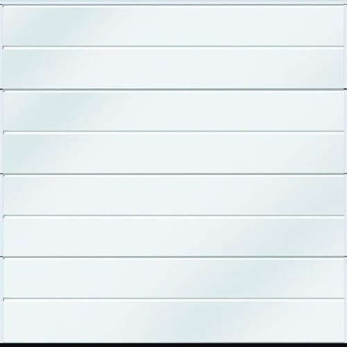 CarTeck centre-ribbed sectional garage door in white, a range of other colours and finishes are available. All CarTeck sectional doors have 40mm thick double-skinned steel panels. In between the outer and inner skins there is a rigid insulating foam making CarTeck sectional garage doors effective at helping keeping out the wind and weather and reducing noise transmission.