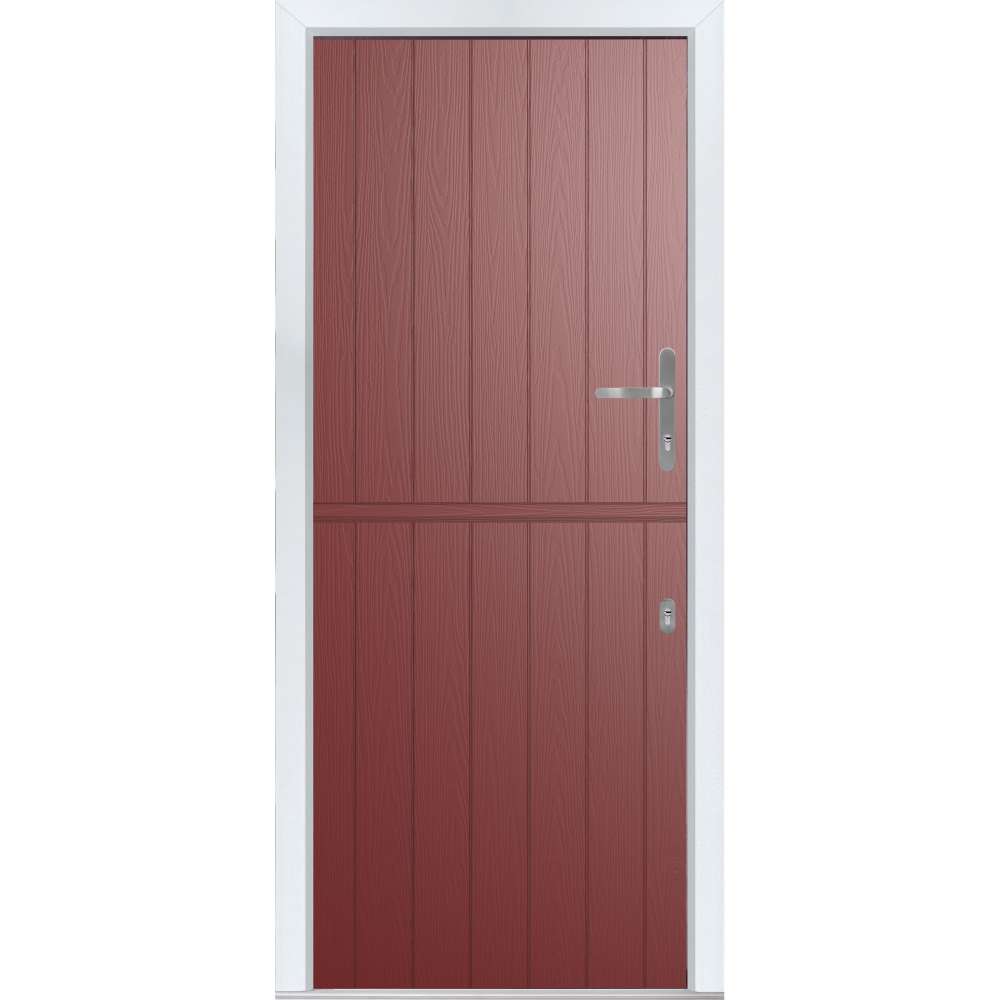 Comp Door Norfolk stable composite entrance door in red. With a palette of 16 colours and a wide range of door furniture. Along with market leading U-values, robust timber core and impeccable build quality this door should improve both the aesthetics and security of your home.