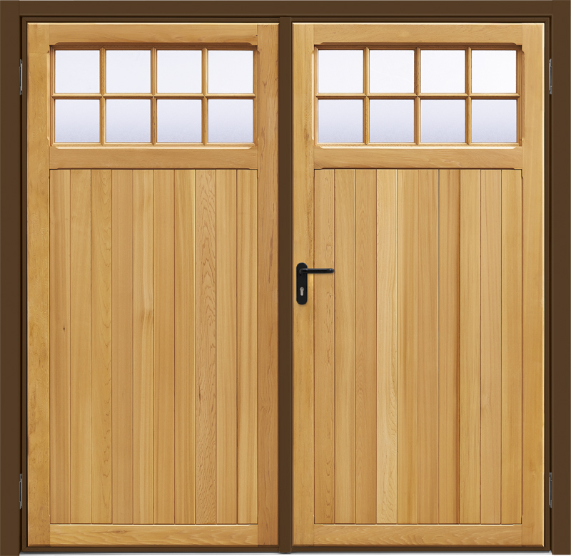 Garador Ashton timber side hinged door base coat finished as standard with the option of pre-staining in Light Oak, Antique Oak, Mahogany, Walnut, Chestnut, Ebony or factory fully finished painting in any ral colour. This door comes as standard with an aluminium threshold & door stays.