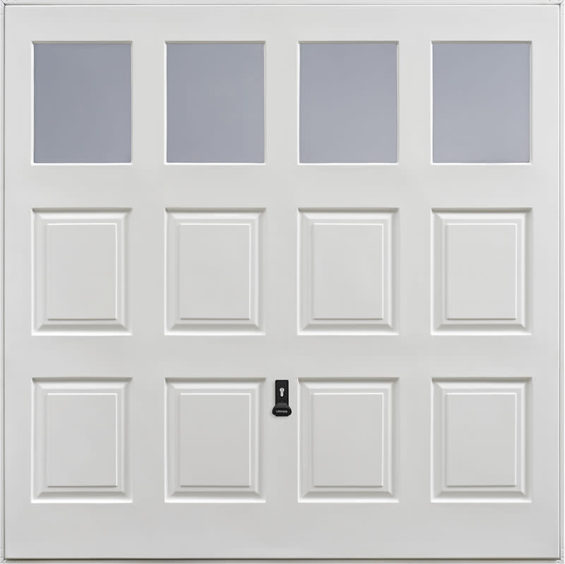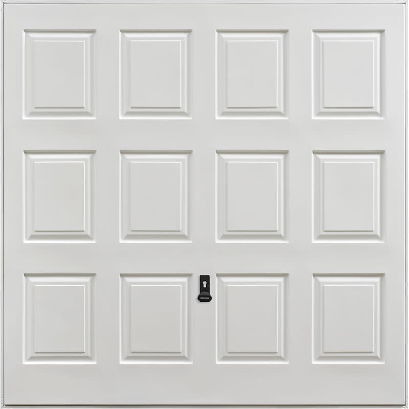 Garador Ashurst fibreglass up and over garage door in gloss white. Optional extras include a maintenance free steel frame and a 4 point locking upgrade. Window options are also available on this door.