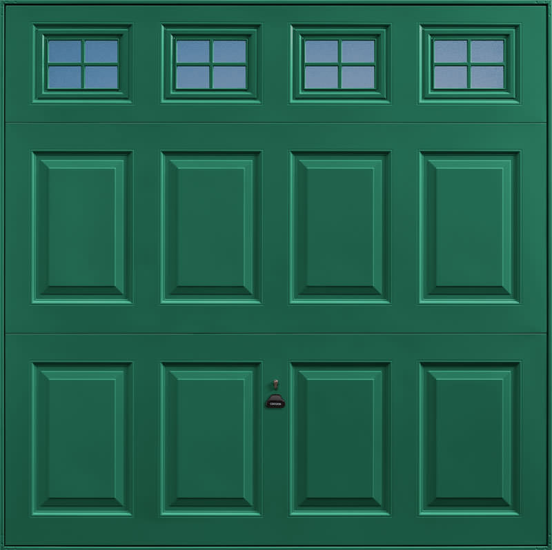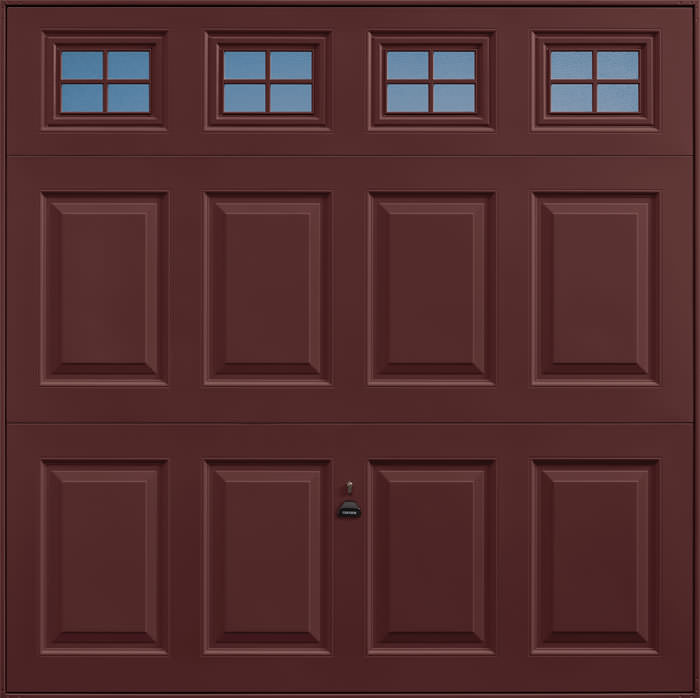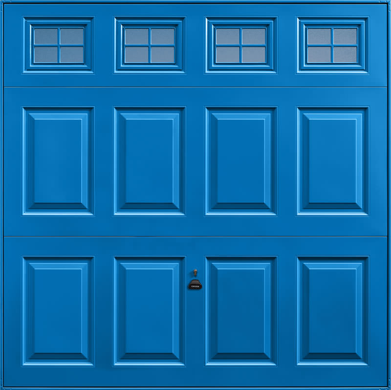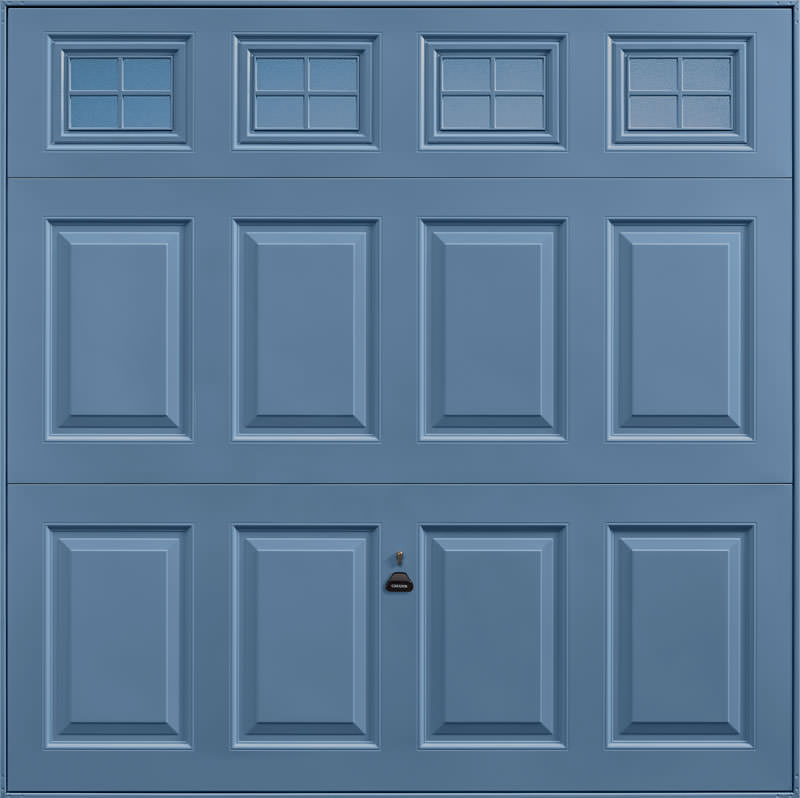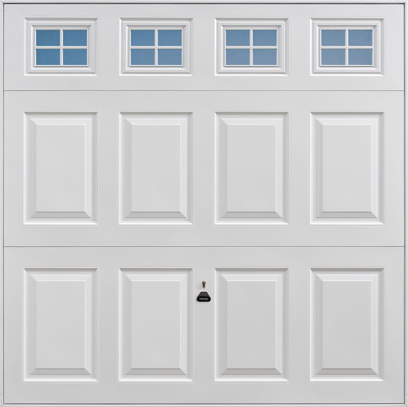 Garador Beaumont with windows steel up and over garage door in white as standard but also available in other colours. Optional extras include a maintenance free steel frame and a 4 point locking upgrade.