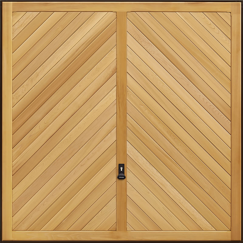 Garador Chevron Cedar timber up and over door base coat finished as standard with the option of pre-staining in Light Oak, Antique Oak, Mahogany, Walnut, Chestnut or Ebony. Other options include a maintenance free steel frame and a 4 point locking upgrade.