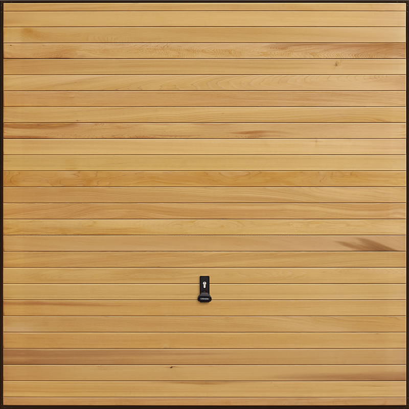 Garador Horizontal Cedar timber up and over door base coat finished as standard with the option of pre-staining in Light Oak, Antique Oak, Mahogany, Walnut, Chestnut or Ebony. Other options include a maintenance free steel frame and a 4 point locking upgrade.