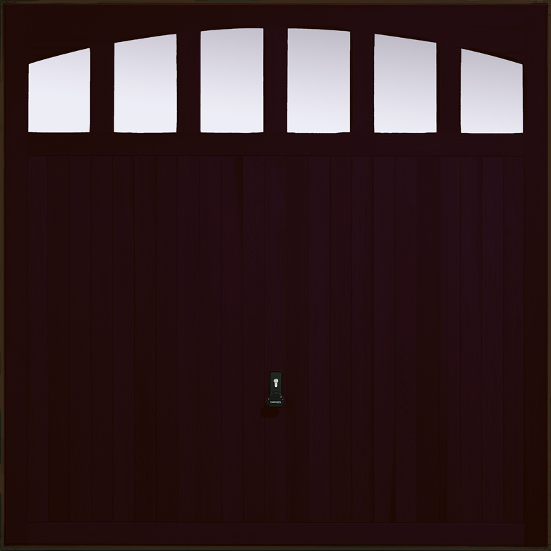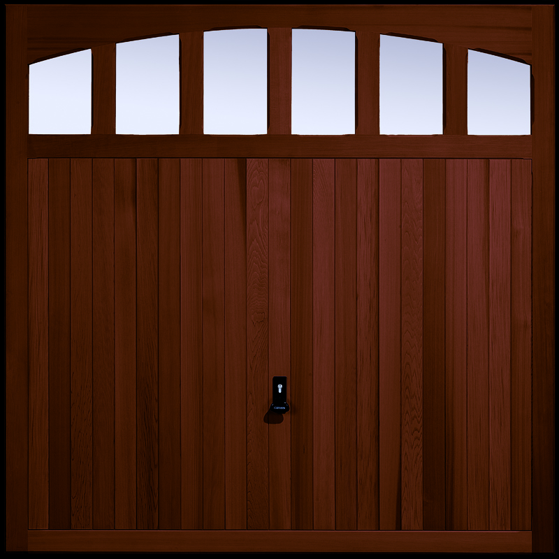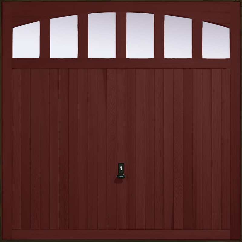 Garador Rochdale timber up and over door base coat finished as standard with the option of pre-staining in Light Oak, Antique Oak, Mahogany, Walnut, Chestnut, Ebony or factory fully finished painting in any ral colour. Other options include a maintenance free steel frame, 4 point locking upgrade and an electric operator.