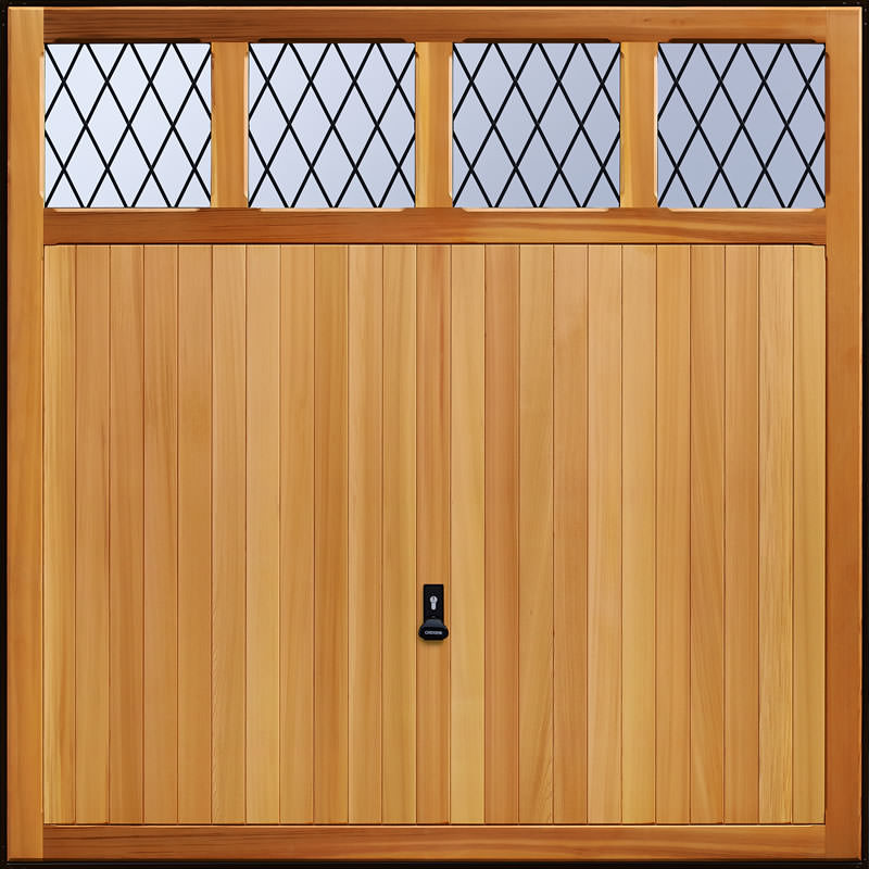 Garador Sandhurst timber up and over door base coat finished as standard with the option of pre-staining in Light Oak, Antique Oak, Mahogany, Walnut, Chestnut or Ebony. Other options include a maintenance free steel frame and a 4 point locking upgrade.