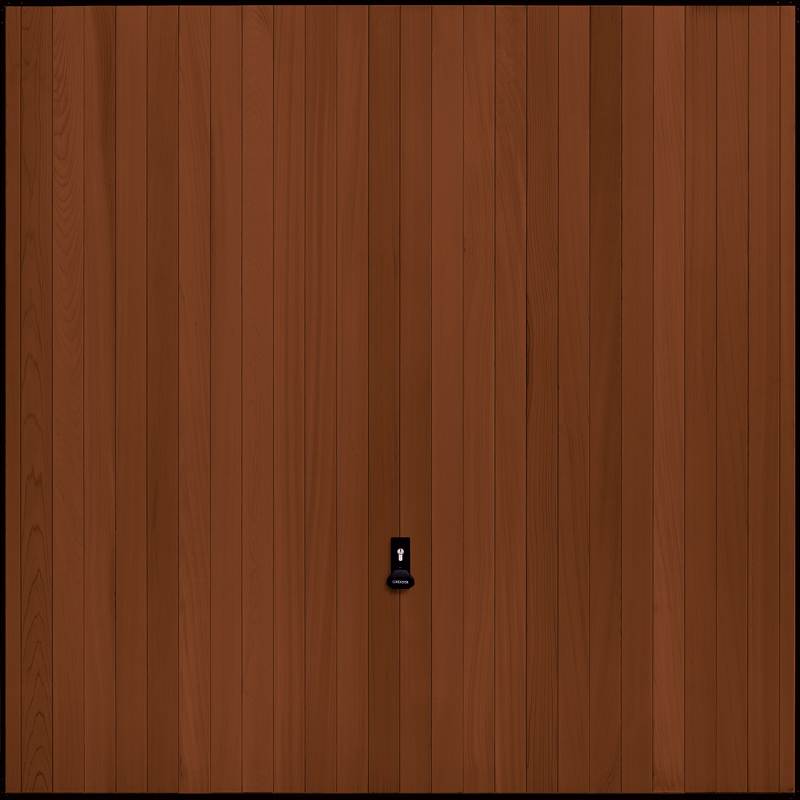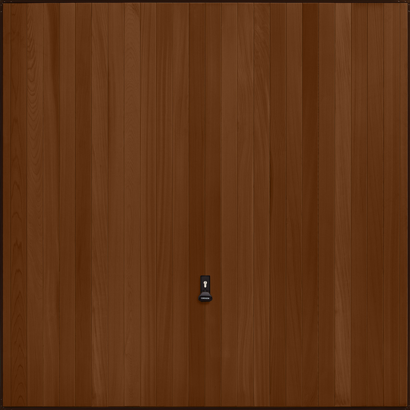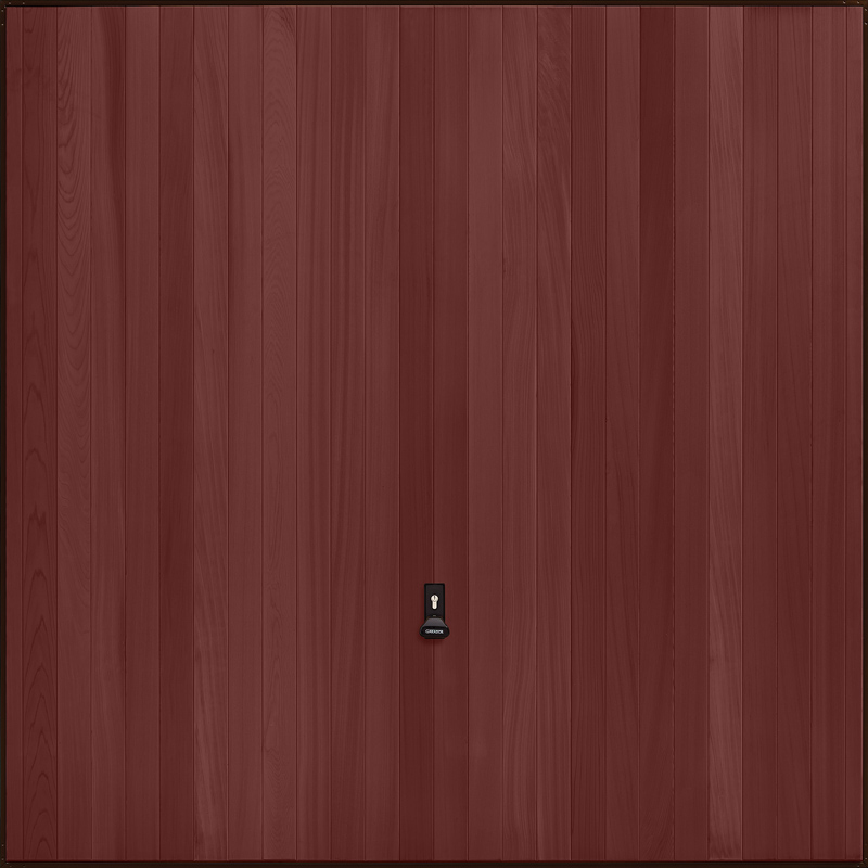 Garador Vertical Cedar timber up and over door base coat finished as standard with the option of pre-staining in Light Oak, Antique Oak, Mahogany, Walnut, Chestnut, Ebony or any ral colour. Other options include a maintenance free steel frame, 4 point locking upgrade or and an electric operator.