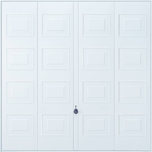 Hormann 2404 Kingston steel up and over garage door in white as standard but also available in other colours. Optional extras include a maintenance free steel frame and a 4 point locking upgrade.