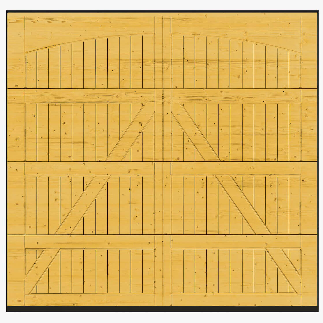 Hormann 405 Nordic Pine timber sectional garage door. Excellently suited for timber houses or buildings with many timber elements, available in 4 surface finishes and 2 timber types. Optional hinged door fittings.