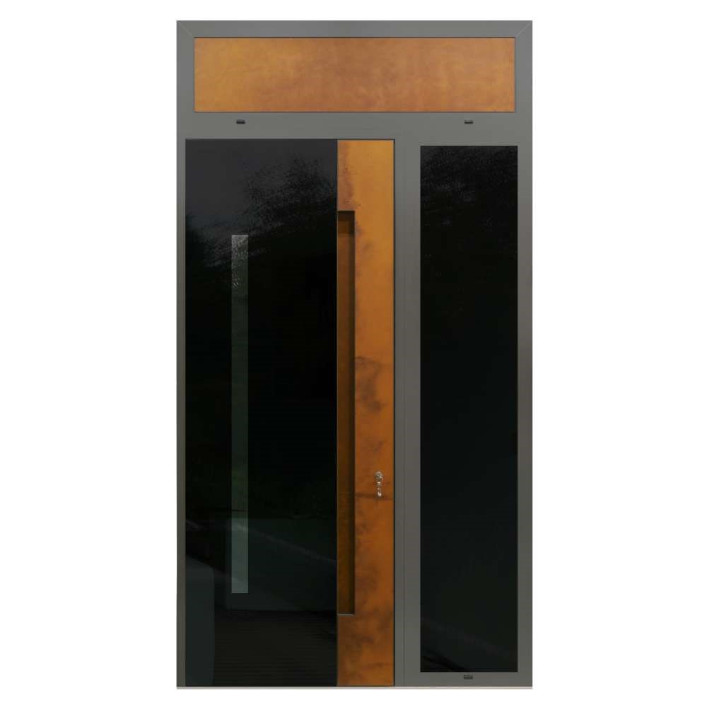 Ryterna RD100 aluminium entrance door style 1055 with glass and corten. Colour: TG68/80043 glass panel ral 9005. All doors are made to measure with a range of panel designs, colours, handles, locking & windows.
