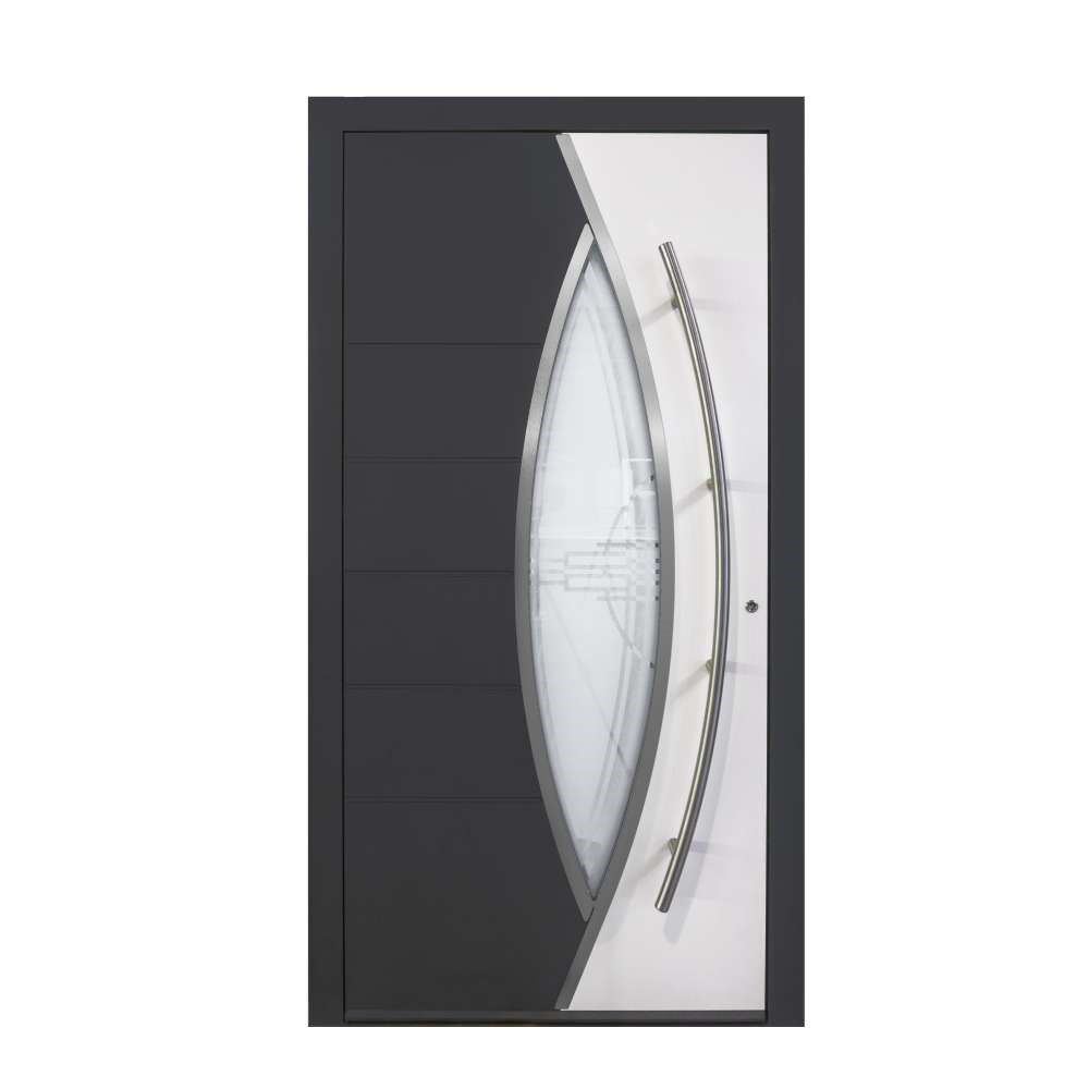 Ryterna RD80 aluminium entrance door style 909 in ral colour TG68/80043 / ral 9016 mat. All doors are made to measure with a range of panel designs, colours, handles, locking & windows.