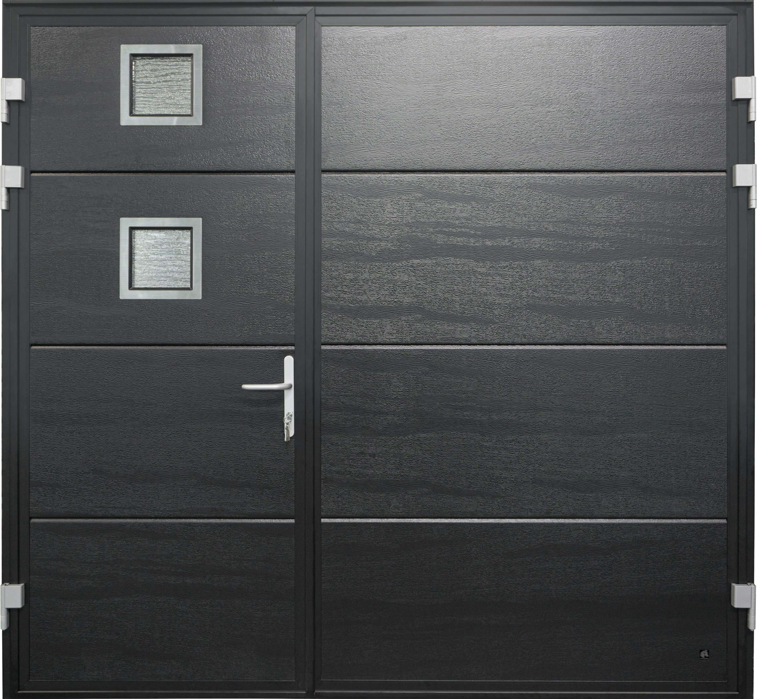 Ryterna SHD side hinged garage door. Made to measure in a range of panel layouts: horizontal, vertical and chevron. Door split available in 50/50 as standard or in any other reasonable proportion upon request. All doors are tailor made in a range of colours, window layouts and finishes.