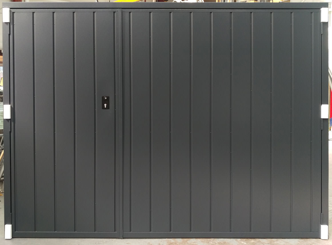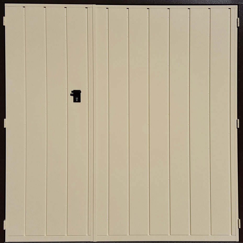 Select Cartmel steel side hinged garage door. Door can be split 1/2 & 1/2 or 2/3 & 1/3. Door is primed as standard ready for on-site finishing with the option of a factory textured powder coat finish in Signal White, Vandyke Brown, Jet Black, Light Ivory, Cobalt Blue, Moss Green, Ruby Red or Anthracite Grey. A woodgrain laminate finish is also available on this door in Golden Oak or Rosewood. Additional options include a maintenance free steel frame and high security euro locking