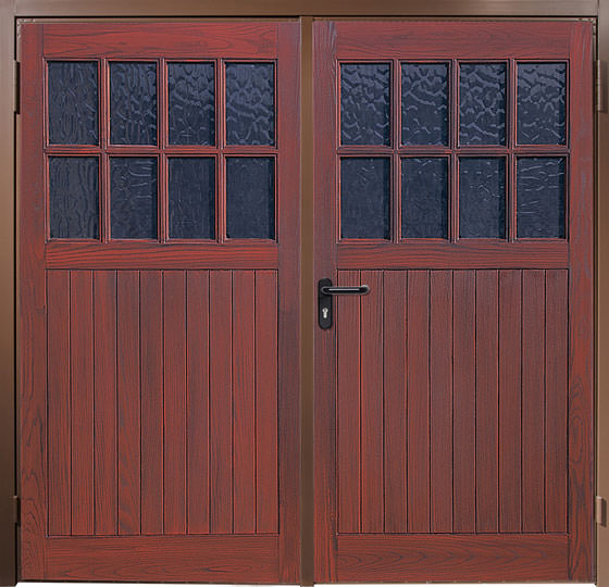 Wessex Sherwood fibreglass side hinged garage door. A woodgrain effect 1/2 & 1/2 split door available in 15 woodgarin colours supplied with all neccesary ironmongery as standard. Optional extras include a maintainance free steel frame, various window options and a high security lock upgrade