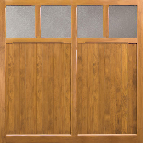 Woodrite Elveden timber up and over garage door, part of the Thetford range. A superior crafted Accoya timber door which is base coated for on-site finishing as standard but also available in 8 factory pre-stained finishes, Light oak, Antique Oak, Chestnut, Mahogany, Walnut, Ebony, Silver and Silver Grey. Timber sub frames or a steel maintenance free option are also available. This door is supplied with clear or stippled windows with a plain, square or diamond lattice leading option.